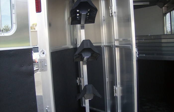 -Removable post with solid mounted saddle racks (one per horse). One swinging
