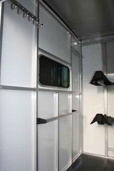 Dome light. 6 Tack hooks. Blanket bar. Brush tray. Sliding window in tack wall.