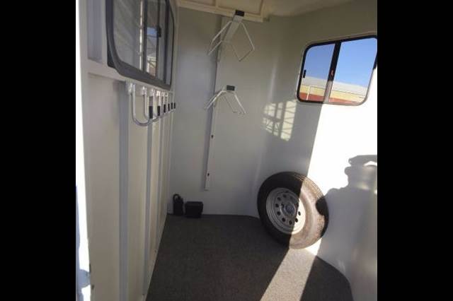 4' Front dress area has 2 saddle racks, bridle hooks, spare tire, and a bulkhead window between the dress area and horse area.
